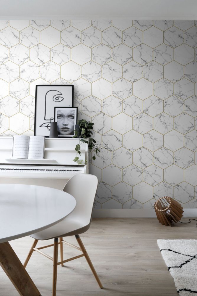 Graue Fototapete mit geometrischem Muster. 3 Tapetenpaneele. Die Tapete hat ein durchgehendes Muster, für eine größere Breite einfach ein weiteres Stück kaufen.
