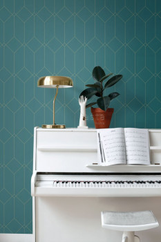 Türkisfarbene geometrische Vliestapete, goldene Linien 139224, Art Deco, Esta