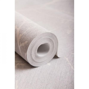 Vliestapete, grauer Stoffimitat, metallische Perlzweige.