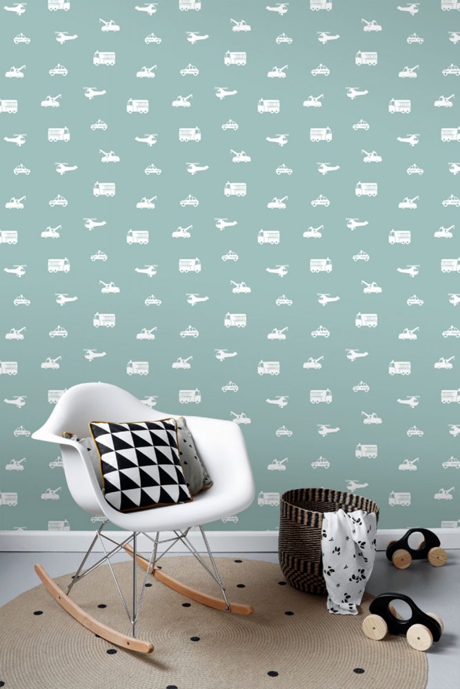 Türkisfarbene Vliestapete für die Wand, Tapete für Jungen mit Autos, Kränen und Hubschraubern.