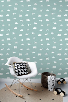 Türkis Vliestapete für Jungen Autos, Helikopter 128864, Little Bandits, Esta