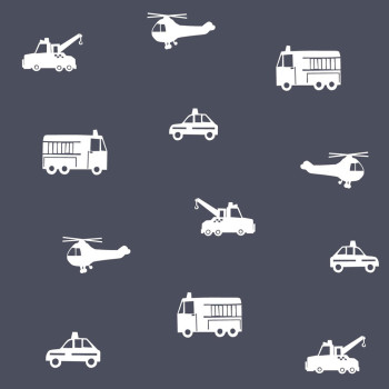 Vliestapete für Jungen - Autos, Kräne, Hubschrauber, dunkelblauer Hintergrund, weißes Muster.
