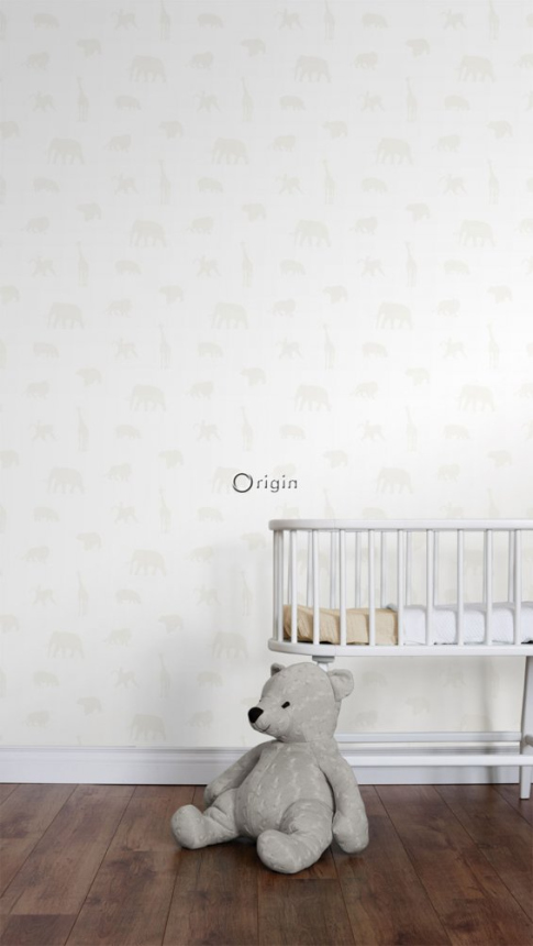 Kindertapete mit Tieren - weißer Hintergrund matt, Tiere mit metallischem Glanz.