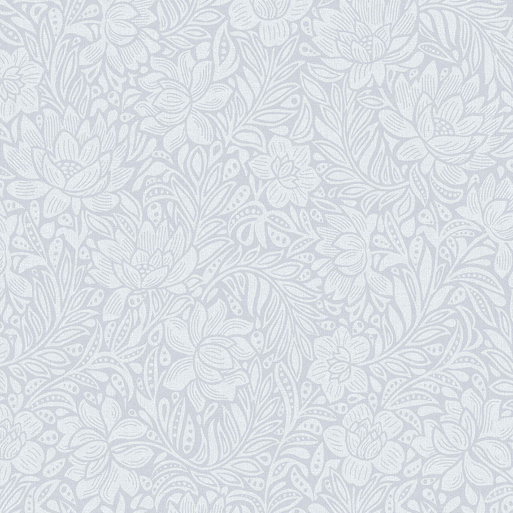 Blumentapete mit Naturmotiven in Hellblau und Grau.