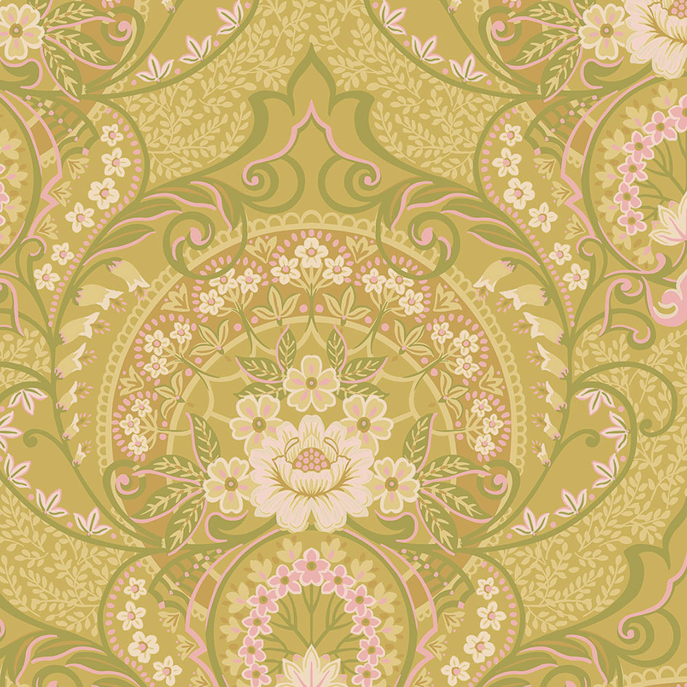 Markantes Blumenmuster in sanften Ocker-, Rosa-, Grün- und Weißtönen.