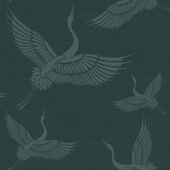 Tapete, Motiv fliegende Vögel, Kraniche, Textilstruktur, Grün- und Blaugrüntöne.