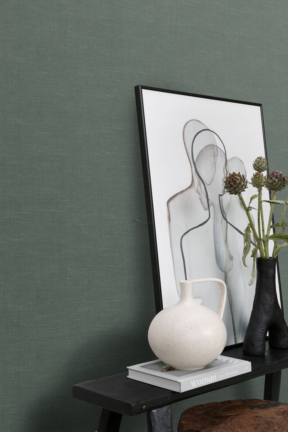 Tapete, Stoffimitat, Melange in Grüntönen.