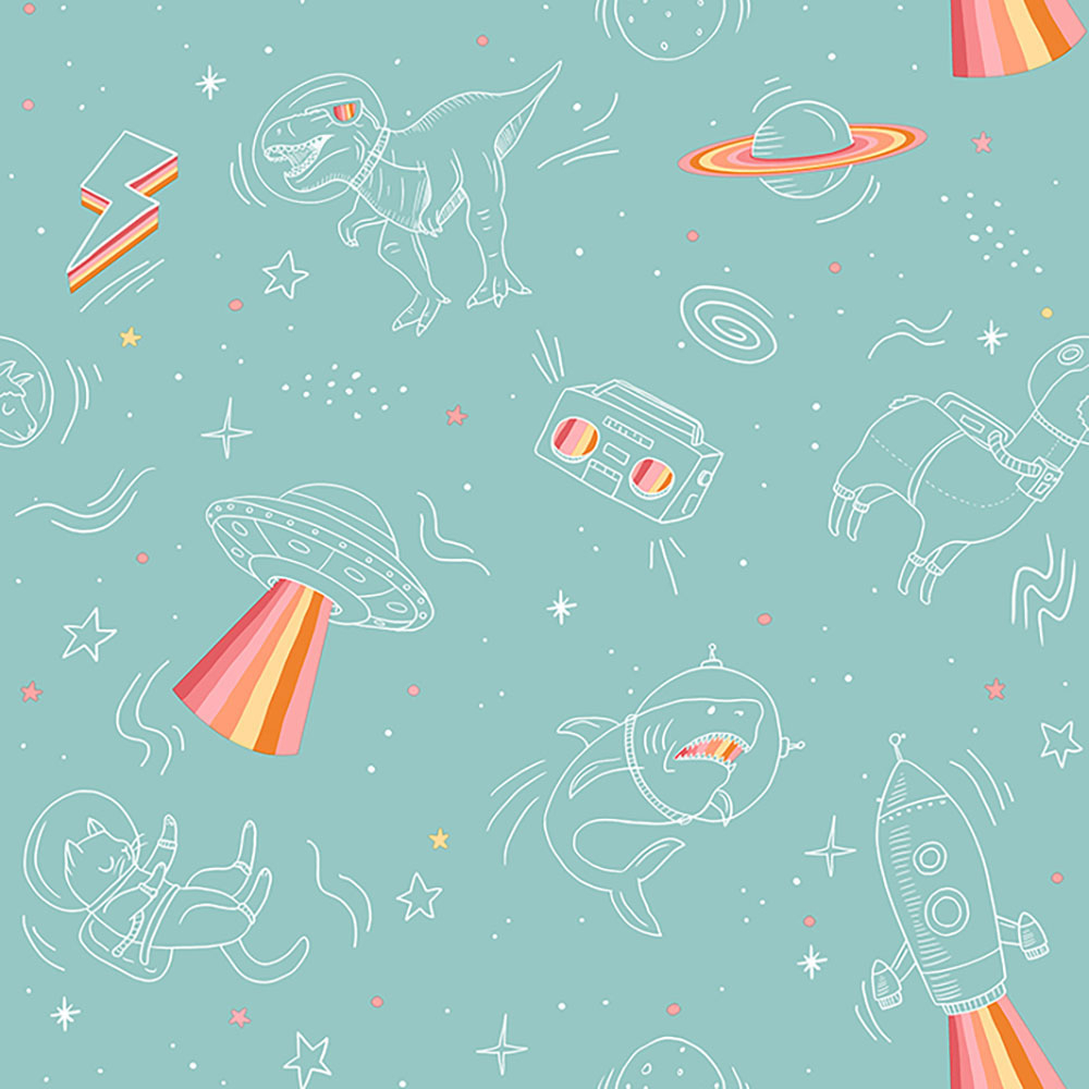 Kindertapete - Dinosaurier und Tiere im Weltall.