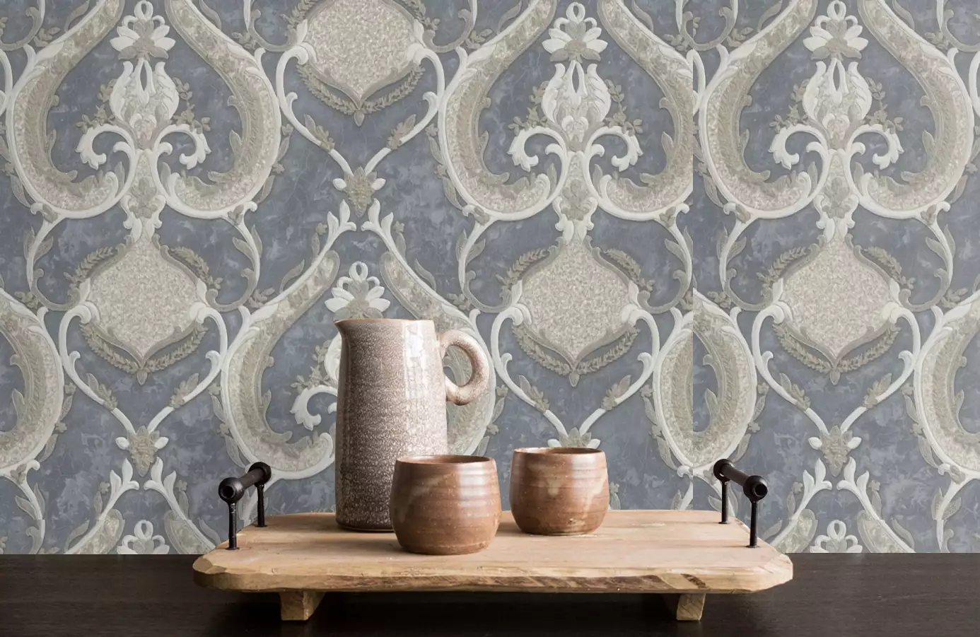 Rollenbreite 1,06 m. Luxus-Vliestapete - Vinyloberfläche, grau-silberner Hintergrund, markantes barockes Ornamentmuster braun-grau mit silbernem Glitzer.