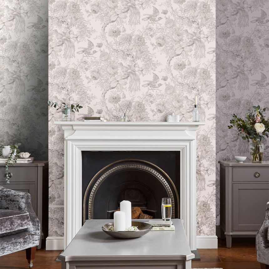 Vliestapete mit grauen Blumen und Vögeln auf weißem, glattem Hintergrund bringt eine angenehme Atmosphäre in den Raum.