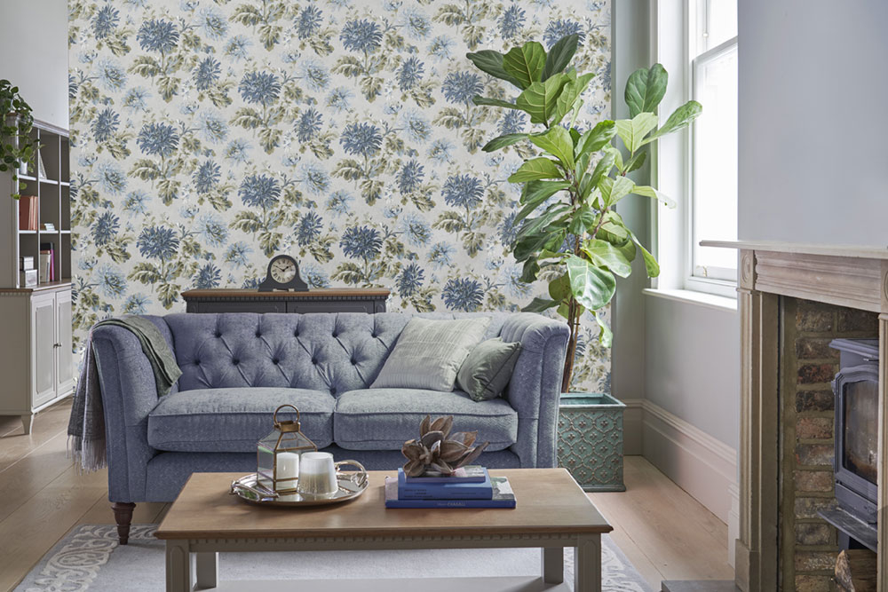 Vliestapete mit bunten blauen Blumen auf einem hellgrauen, glatten Hintergrund bringt eine angenehme Atmosphäre in den Innenraum.