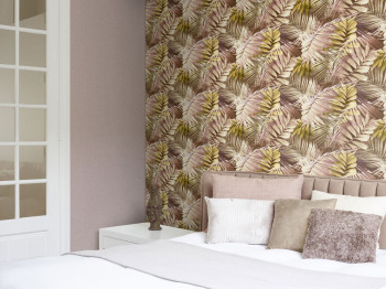Braun-rosa grob strukturierte Tapete mit Palmenblattmotiven.