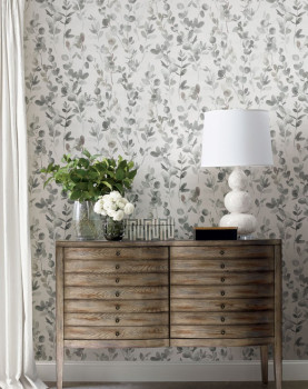 Glatte Vliestapete, Eukalyptusblätter und -zweige in Grau- und Graubeigetönen.