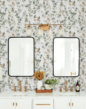 Glatte Vliestapete, Eukalyptusblätter und Zweige in Grüntönen.
