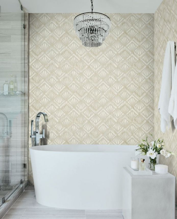 Cremefarbene Vliestapete, stilisierte Muscheln mit Perlglanz.