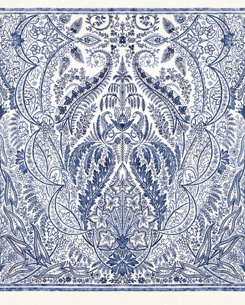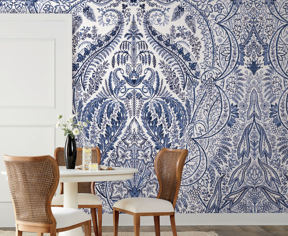 Blau-weiße, vorgeklebte Fototapete mit reichem, von der Natur inspiriertem Ornamentmuster.