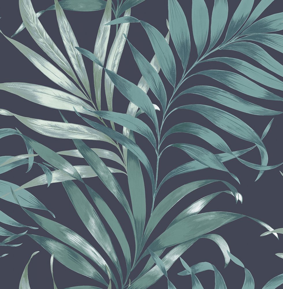 Vliestapete mit einem Motiv aus grünen Palmenblättern auf schwarzem Hintergrund schafft eine angenehme Atmosphäre im Innenraum.