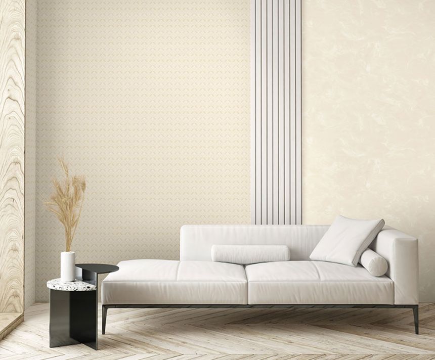 Luxuriöse halbglänzende hellbeige strukturierte Vliestapete mit Vinyloberfläche.