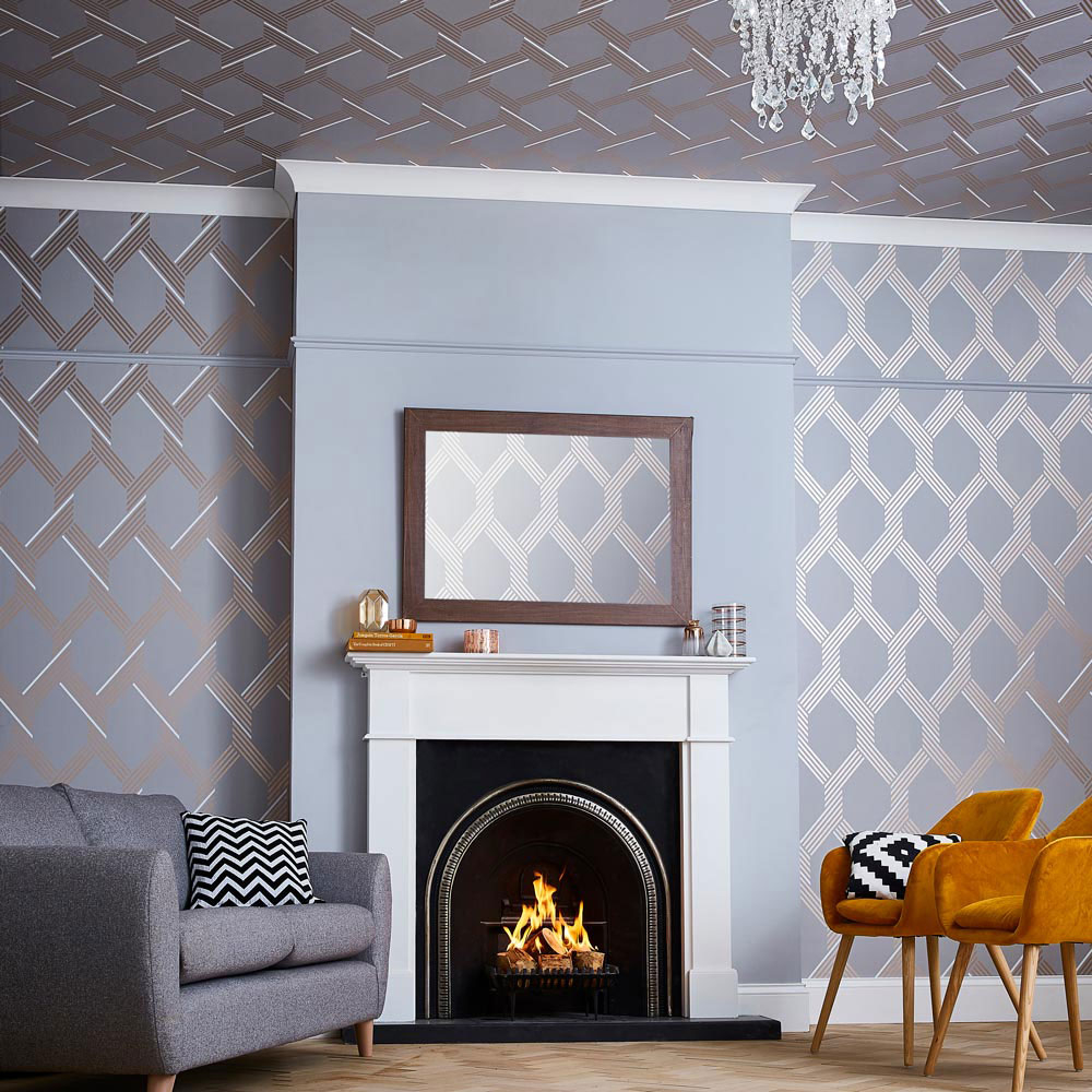 Graue Vliestapete mit glatter Papieroberfläche, geometrisches Muster in roségoldener Farbe.