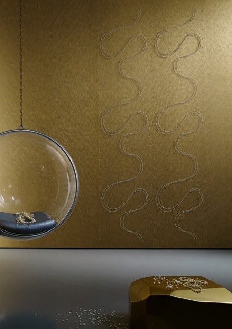 Rundungen aus dekorativen Perlen auf dunkelgrauen Vliestapete.